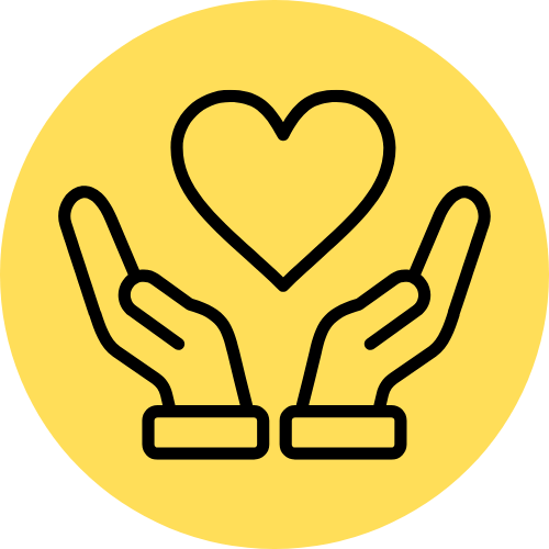 • Line drawing of a bouquet of flowers wrapped in paper, with a ribbon, on a yellow circular background.